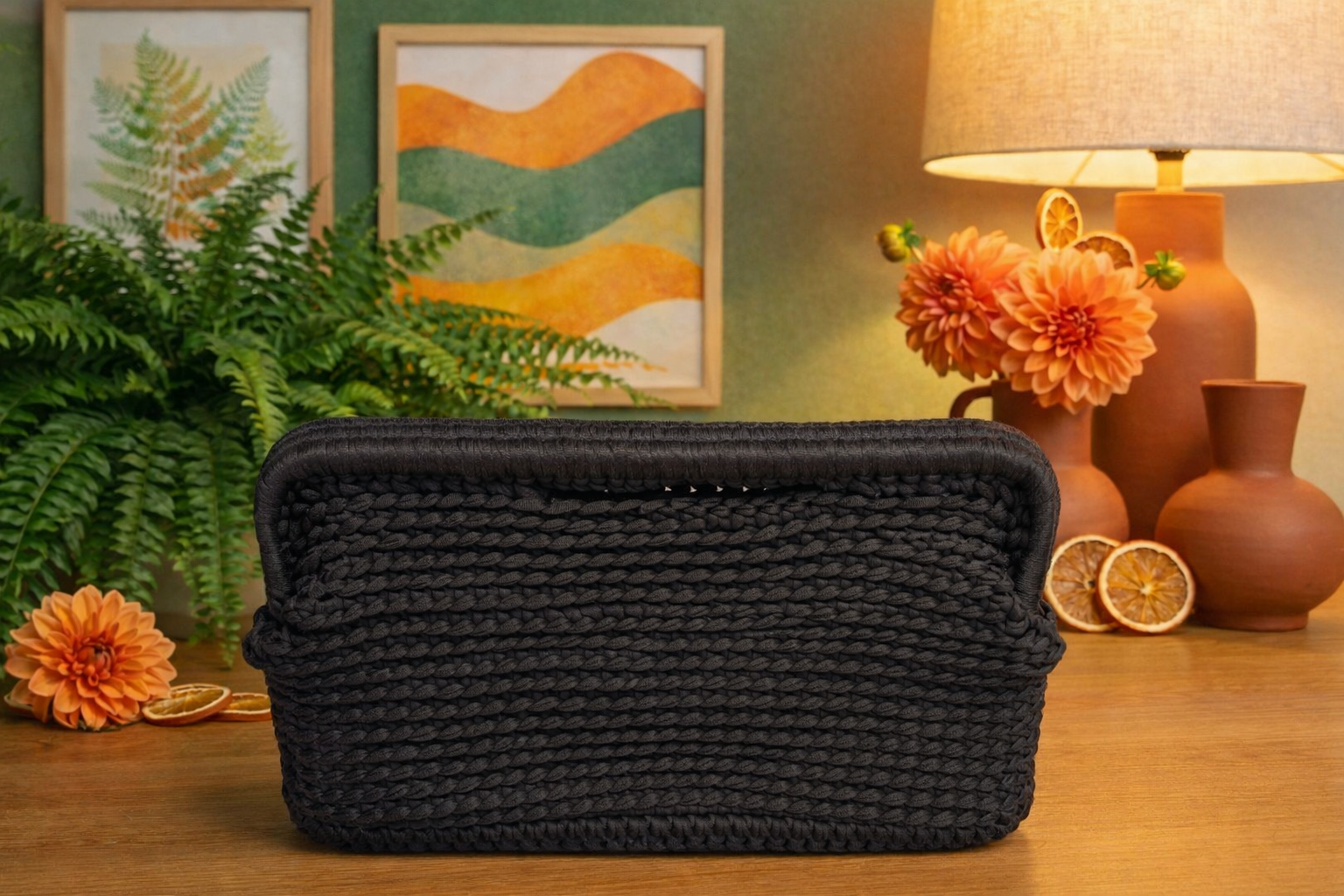 Artisanal Charm: The handcrafted crochet clutch features a warm terracotta hue and structured silhouette, blending natural texture with timeless style.